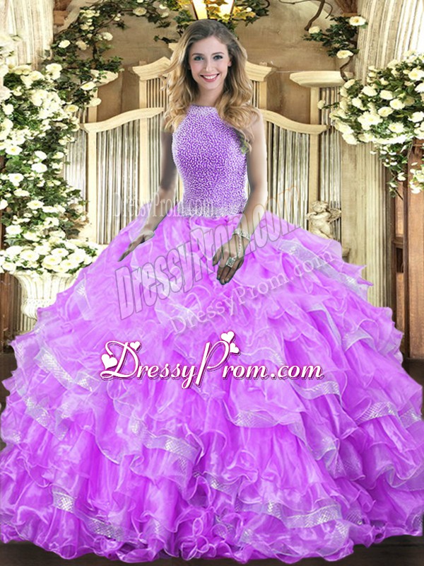 Neckline : High-neckShown Color : LavenderSilhouette : Ball GownsSleeve Length : sleevelessHemline : floor lengthBack Detail : Lace upFabric : OrganzaEmbellishment : Beading,Ruffled LayersOccasion : Military Ball,Sweet 16,QuinceaneraSeason : Spring,Summer,Fall,Winter