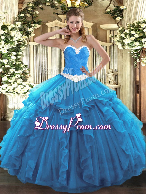 Neckline : SweetheartShown Color : Baby BlueSilhouette : Ball GownsSleeve Length : sleevelessHemline : floor lengthBack Detail : Lace upFabric : OrganzaEmbellishment : Appliques,RufflesOccasion : Military Ball,Sweet 16,QuinceaneraSeason : Spring,Summer,Fall,Winter