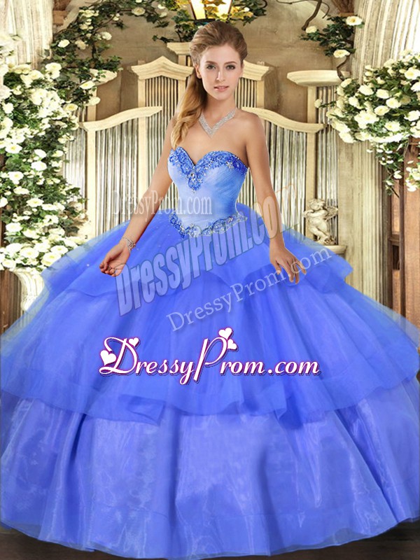 Neckline : SweetheartShown Color : BlueSilhouette : Ball GownsSleeve Length : sleevelessHemline : floor lengthBack Detail : Lace upFabric : TulleEmbellishment : Beading,Ruffled LayersOccasion : Military Ball,Sweet 16,QuinceaneraSeason : Spring,Summer,Fall,Winter