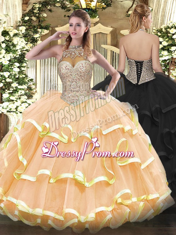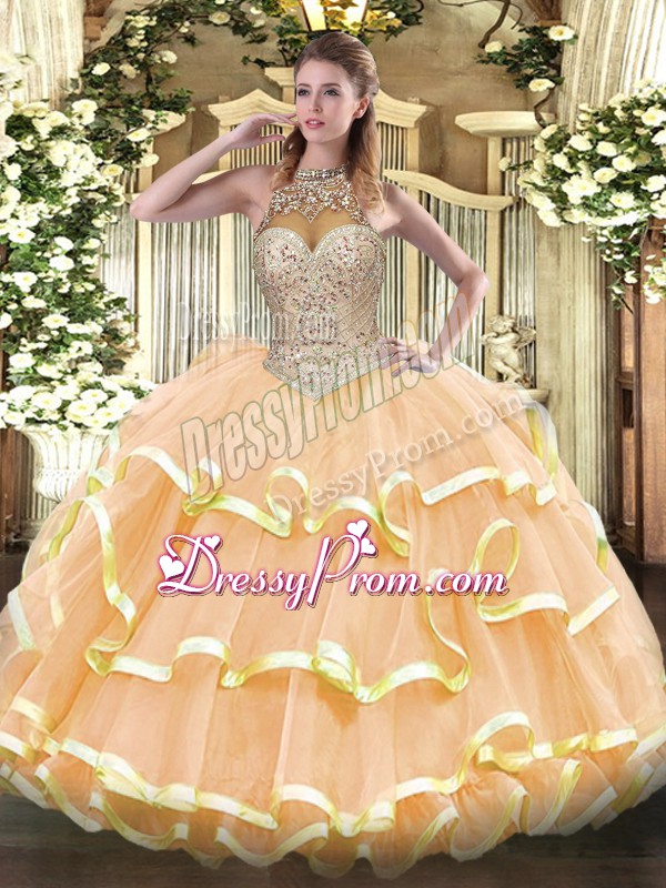 Neckline : Halter topShown Color : PeachSilhouette : Ball GownsSleeve Length : sleevelessHemline : floor lengthBack Detail : Lace upFabric : OrganzaEmbellishment : Beading,Ruffled LayersOccasion : Military Ball,Sweet 16,QuinceaneraSeason : Spring,Summer,Fall,Winter