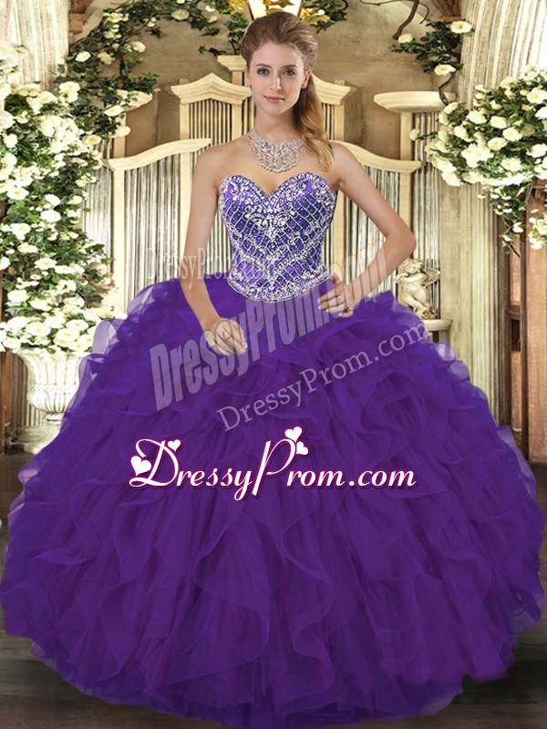Neckline : SweetheartShown Color : PurpleSilhouette : Ball GownsSleeve Length : sleevelessHemline : floor lengthBack Detail : Lace upFabric : LaceEmbellishment : Beading,Ruffled LayersOccasion : Military Ball,Sweet 16,QuinceaneraSeason : Spring,Summer,Fall,Winter