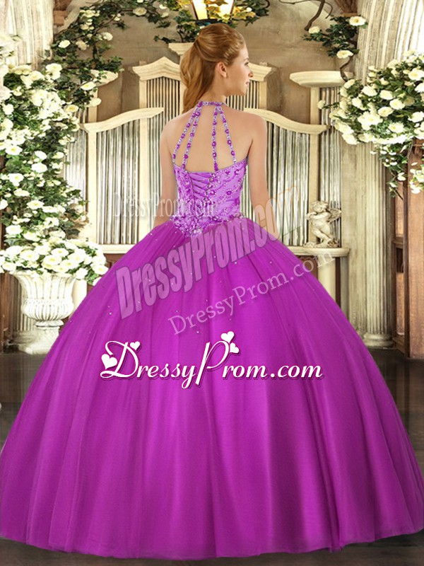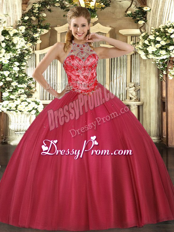Neckline : Halter topShown Color : Coral RedSilhouette : Ball GownsSleeve Length : sleevelessHemline : floor lengthBack Detail : Lace upFabric : SatinEmbellishment : BeadingOccasion : Military Ball,Sweet 16,QuinceaneraSeason : Spring,Summer,Fall,Winter