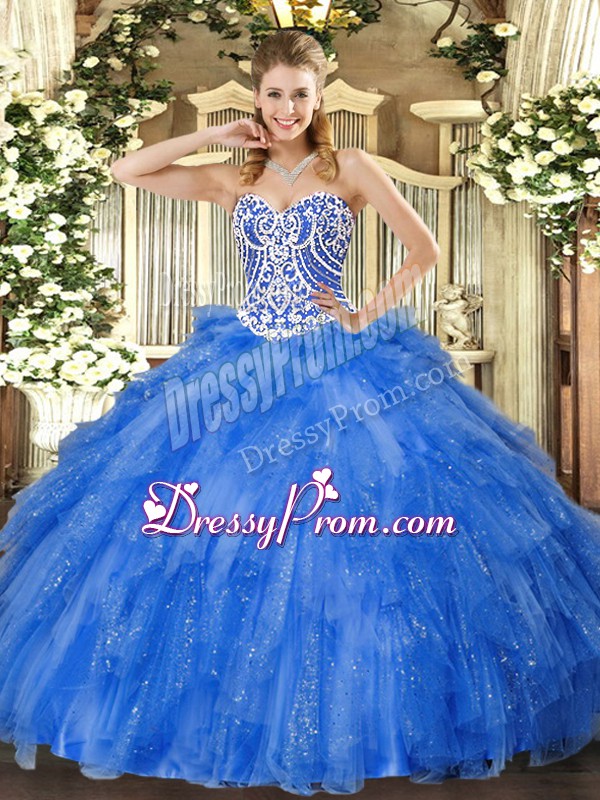 Sweetheart Sleeveless 15th Birthday Dress Floor Length Beading and Ruffles Blue Tulle