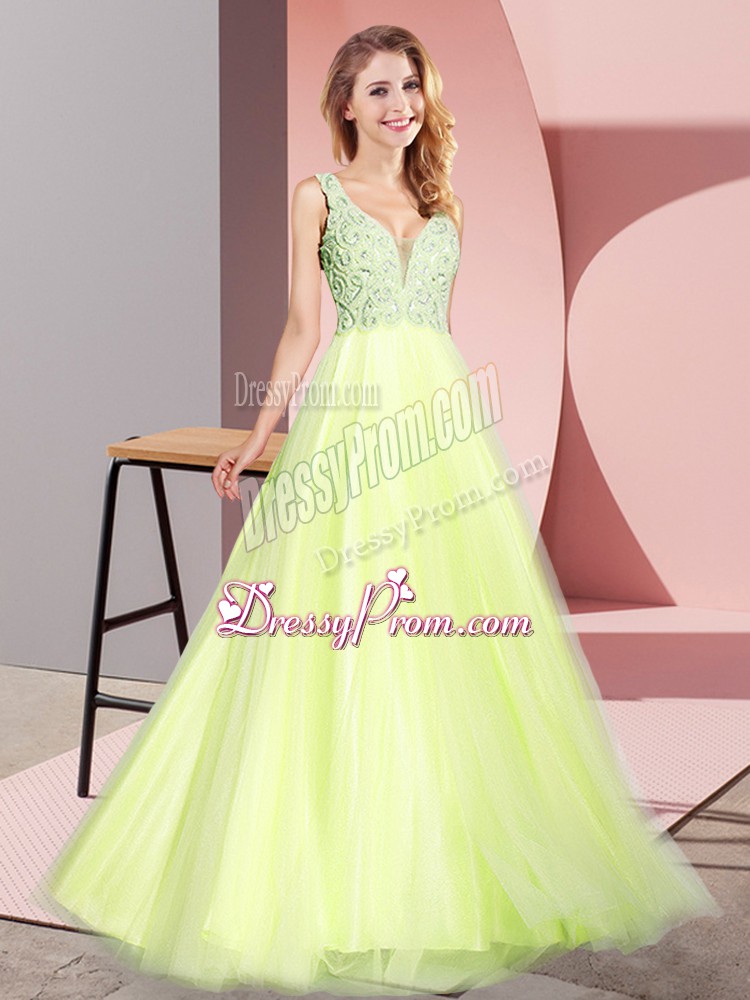 Neckline : V-neckShown Color : Light YellowSilhouette : A-lineSleeve Length : sleevelessHemline : floor lengthBack Detail : ZipperFabric : TulleEmbellishment : LaceOccasion : Prom,PartySeason : Spring,Summer,Fall,Winter