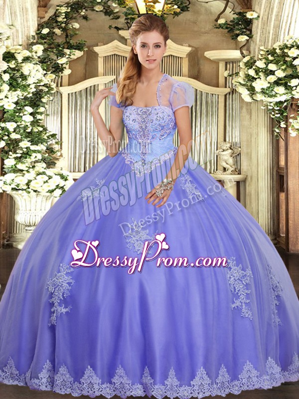 Neckline : StraplessShown Color : LavenderSilhouette : Ball GownsSleeve Length : sleevelessHemline : floor lengthBack Detail : Lace upFabric : TulleEmbellishment : AppliquesOccasion : Military Ball,Sweet 16,QuinceaneraSeason : Spring,Summer,Fall,Winter