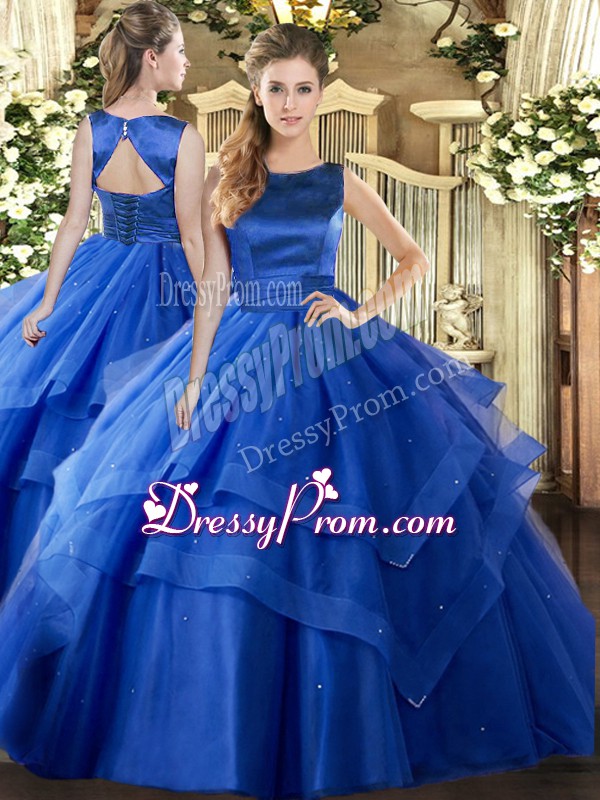 Neckline : ScoopShown Color : BlueSilhouette : Ball GownsSleeve Length : sleevelessHemline : floor lengthBack Detail : Lace upFabric : TulleEmbellishment : Ruffled LayersOccasion : Military Ball,Sweet 16,QuinceaneraSeason : Spring,Summer,Fall,Winter