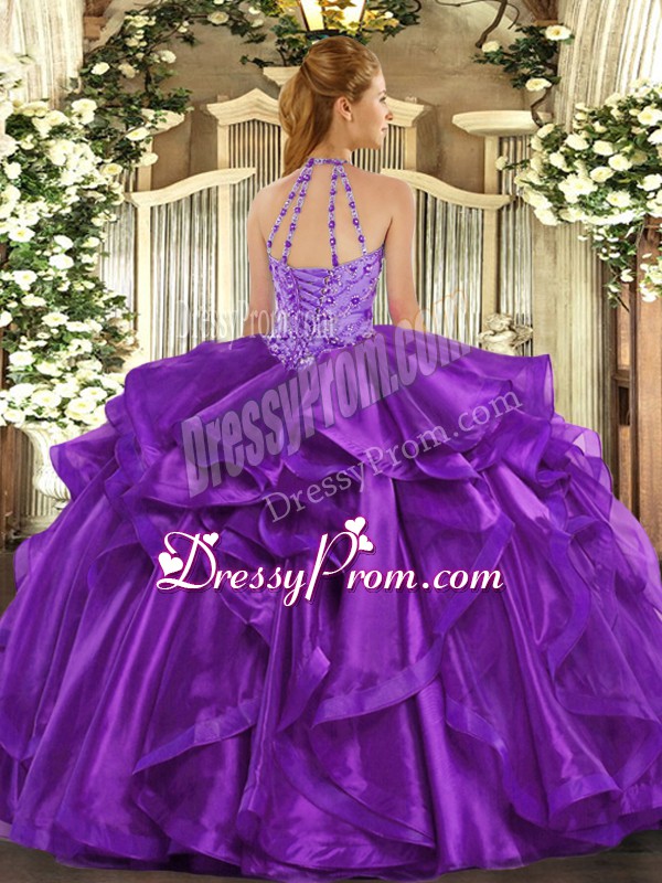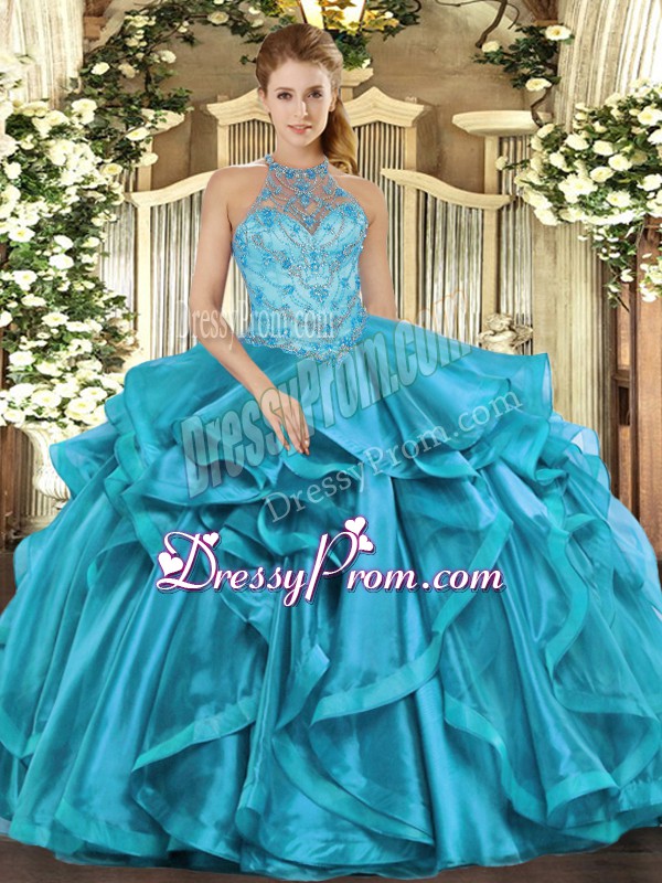 Neckline : Halter topShown Color : Teal Silhouette : Ball GownsSleeve Length : sleevelessHemline : floor lengthBack Detail : Lace upFabric : OrganzaEmbellishment : BeadingOccasion : Military Ball,Sweet 16,QuinceaneraSeason : Spring,Summer,Fall,Winter