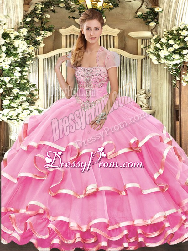 Neckline : StraplessShown Color : Rose Pink Silhouette : Ball GownsSleeve Length : sleevelessHemline : floor lengthBack Detail : Lace upFabric : OrganzaEmbellishment : Appliques,Ruffled LayersOccasion : Military Ball,Sweet 16,QuinceaneraSeason : Spring,Summer,Fall,Winter