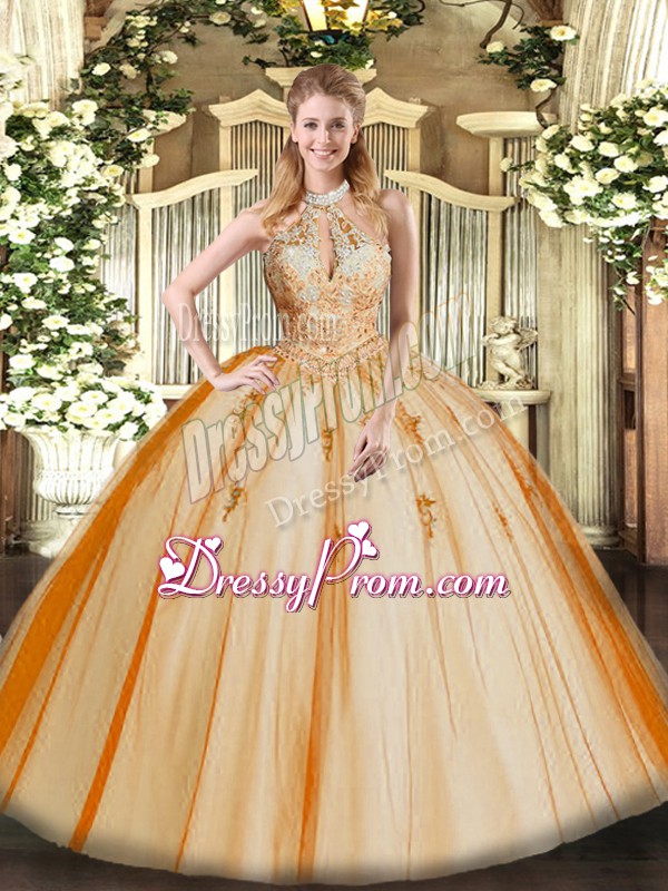 Neckline : Halter topShown Color : Orange RedSilhouette : Ball GownsSleeve Length : sleevelessHemline : floor lengthBack Detail : Lace upFabric : TulleEmbellishment : Lace,AppliquesOccasion : Military Ball,Sweet 16,QuinceaneraSeason : Spring,Summer,Fall,Winter