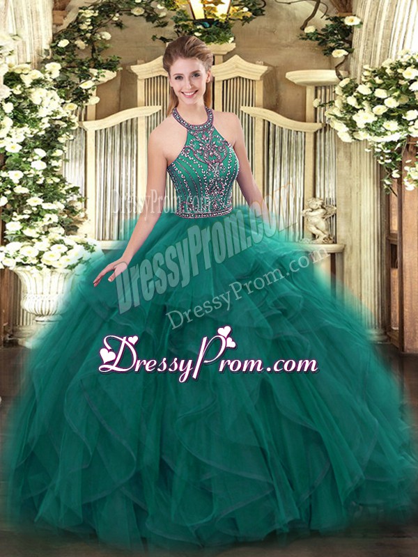 Neckline : Halter topShown Color : Teal Silhouette : Ball GownsSleeve Length : sleevelessHemline : floor lengthBack Detail : Lace upFabric : TulleEmbellishment : Beading,RufflesOccasion : Military Ball,Sweet 16,QuinceaneraSeason : Spring,Summer,Fall,Winter