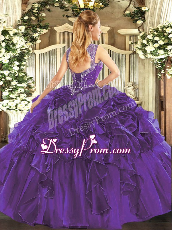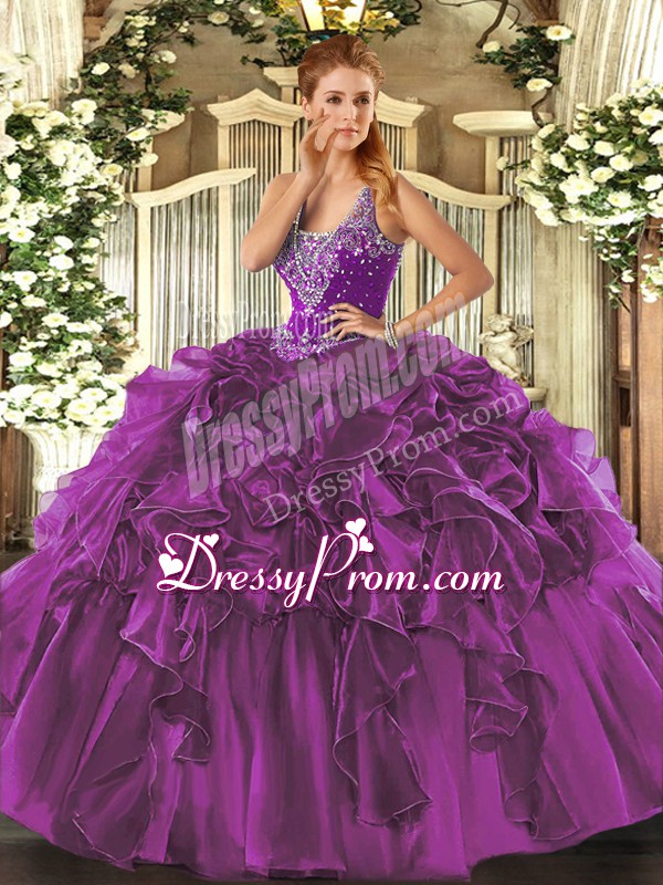Neckline : StrapsShown Color : Eggplant PurpleSilhouette : Ball GownsSleeve Length : sleevelessHemline : floor lengthBack Detail : Lace upFabric : OrganzaEmbellishment : Beading,RufflesOccasion : Military Ball,Sweet 16Season : Spring,Summer,Fall,Winter
