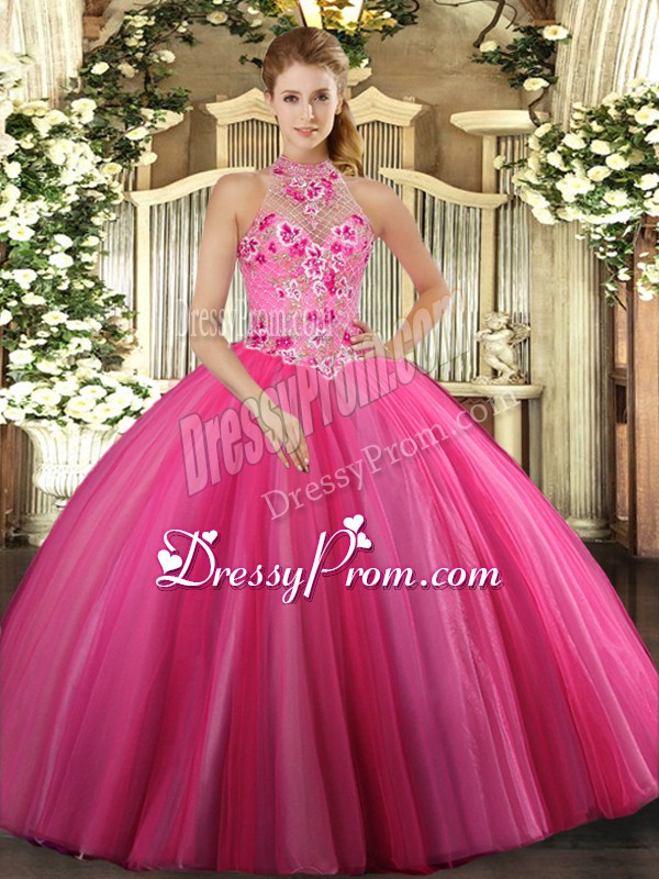 Neckline : Halter topShown Color : Hot PinkSilhouette : Ball GownsSleeve Length : sleevelessHemline : floor lengthBack Detail : Lace upFabric : TulleEmbellishment : EmbroideryOccasion : Military Ball,Sweet 16,QuinceaneraSeason : Spring,Summer,Fall,Winter