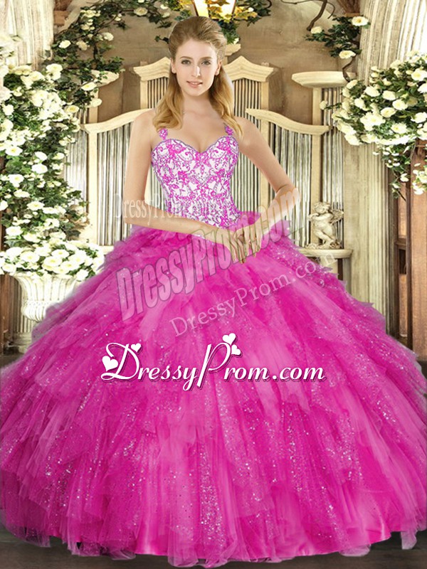 Neckline : StrapsShown Color : FuchsiaSilhouette : Ball GownsSleeve Length : sleevelessHemline : floor lengthBack Detail : Lace upFabric : TulleEmbellishment : Appliques,RufflesOccasion : Sweet 16,QuinceaneraSeason : Spring,Summer,Fall,Winter