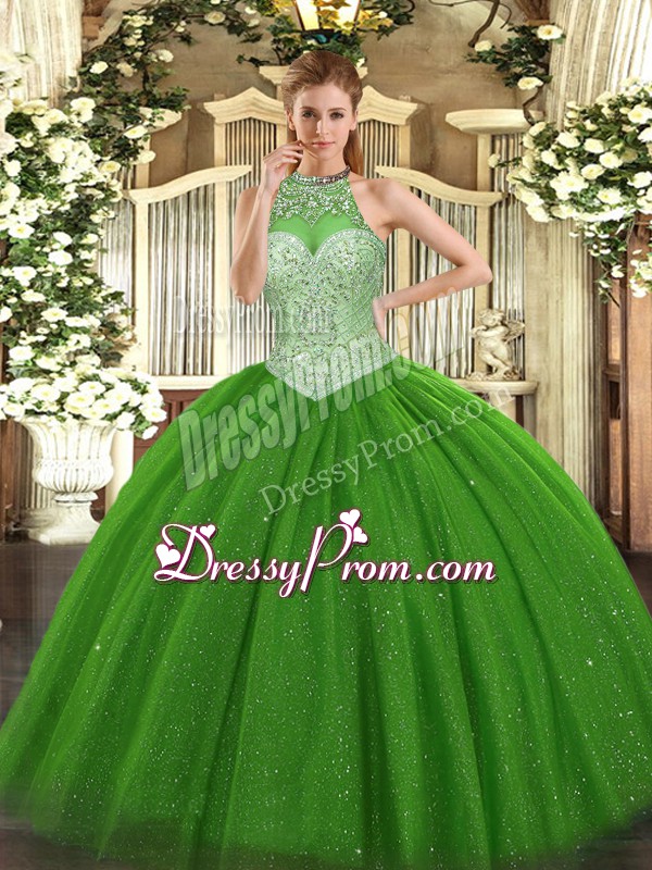 Neckline : Halter topShown Color : GreenSilhouette : Ball GownsSleeve Length : sleevelessHemline : floor lengthBack Detail : Lace upFabric : TulleEmbellishment : BeadingOccasion : Military Ball,Sweet 16,QuinceaneraSeason : Spring,Summer,Fall,Winter