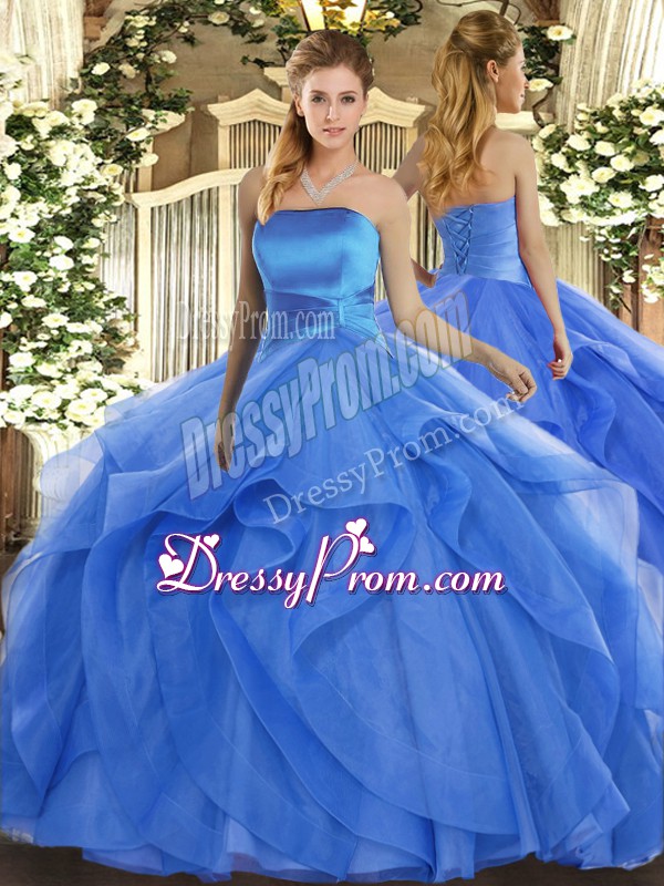 Neckline : StraplessShown Color : BlueSilhouette : Ball GownsSleeve Length : sleevelessHemline : floor lengthBack Detail : Lace upFabric : TulleEmbellishment : RufflesOccasion : Military Ball,Sweet 16,QuinceaneraSeason : Spring,Summer,Fall,Winter