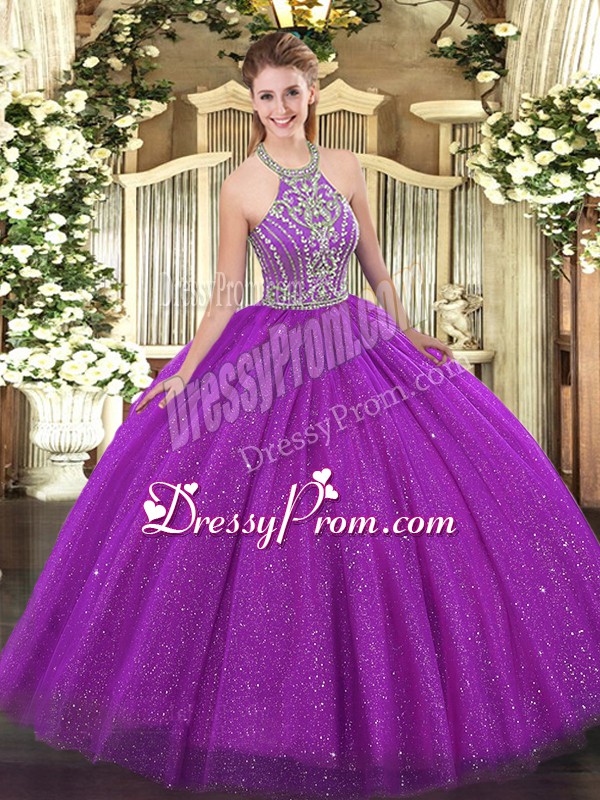 Neckline : Halter topShown Color : FuchsiaSilhouette : Ball GownsSleeve Length : sleevelessHemline : floor lengthBack Detail : Lace upFabric : TulleEmbellishment : BeadingOccasion : Military Ball,Sweet 16,QuinceaneraSeason : Spring,Summer,Fall,Winter