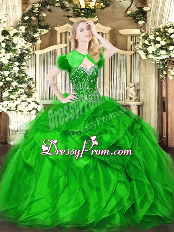 Affordable Green Ball Gowns Organza Sweetheart Sleeveless Beading and Ruffles Floor Length Lace Up Quinceanera Dresses