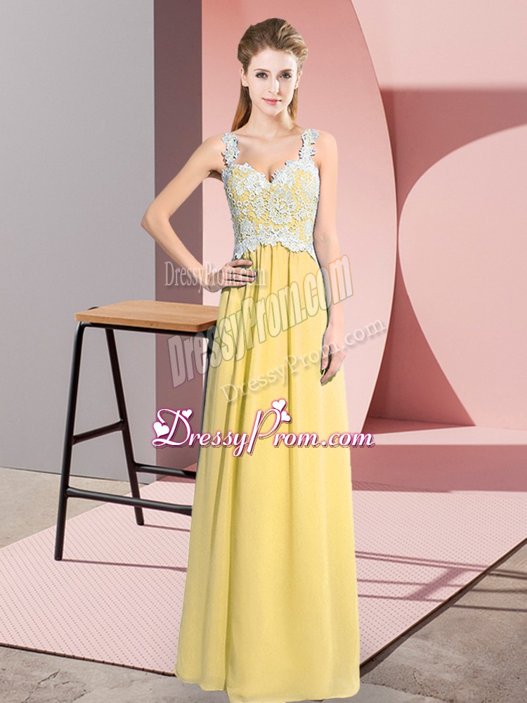 Neckline : V-neckShown Color : YellowSilhouette : EmpireSleeve Length : sleevelessHemline : floor lengthBack Detail : ZipperFabric : ChiffonEmbellishment : LaceOccasion : Prom,PartySeason : Spring,Summer,Fall,Winter