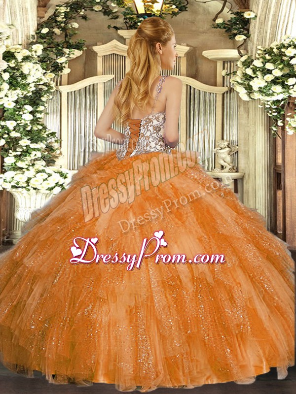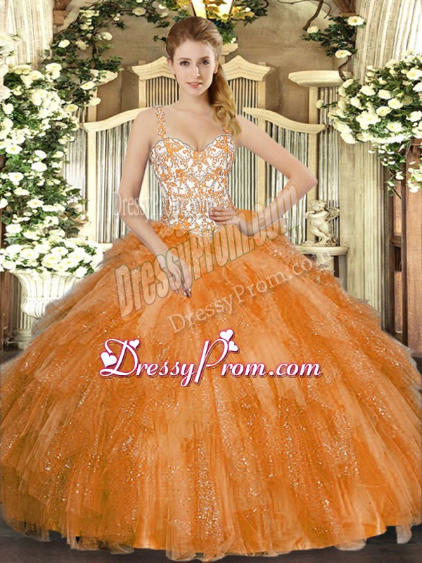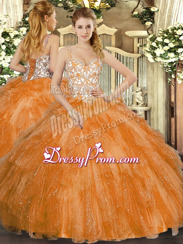 Neckline : StrapsShown Color : OrangeSilhouette : Ball GownsSleeve Length : sleevelessHemline : floor lengthBack Detail : Lace upFabric : TulleEmbellishment : Beading,RufflesOccasion : Sweet 16,QuinceaneraSeason : Spring,Summer,Fall,Winter