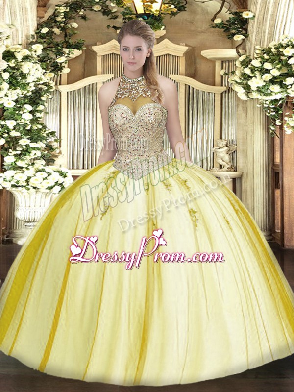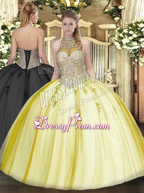 Neckline : Halter topShown Color : YellowSilhouette : Ball GownsSleeve Length : sleevelessHemline : floor lengthBack Detail : Lace upFabric : TulleEmbellishment : Beading,AppliquesOccasion : Military Ball,Sweet 16,QuinceaneraSeason : Spring,Summer,Fall,Winter