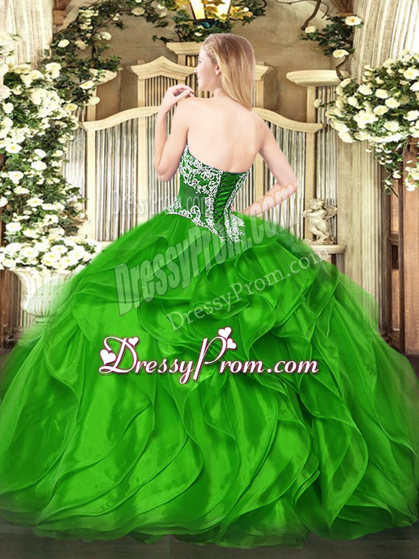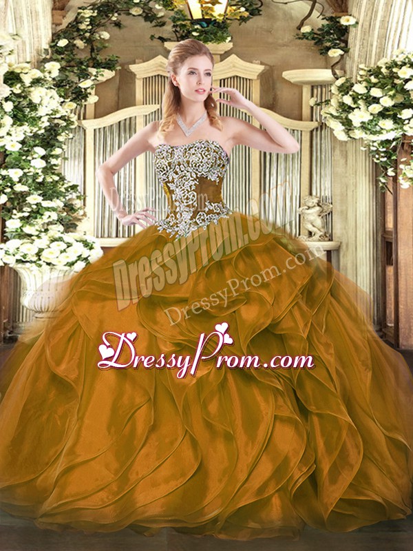 Neckline : StraplessShown Color : BrownSilhouette : Ball GownsSleeve Length : sleevelessHemline : floor lengthBack Detail : Lace upFabric : OrganzaEmbellishment : Beading,RufflesOccasion : Military Ball,Sweet 16,QuinceaneraSeason : Spring,Summer,Fall,Winter