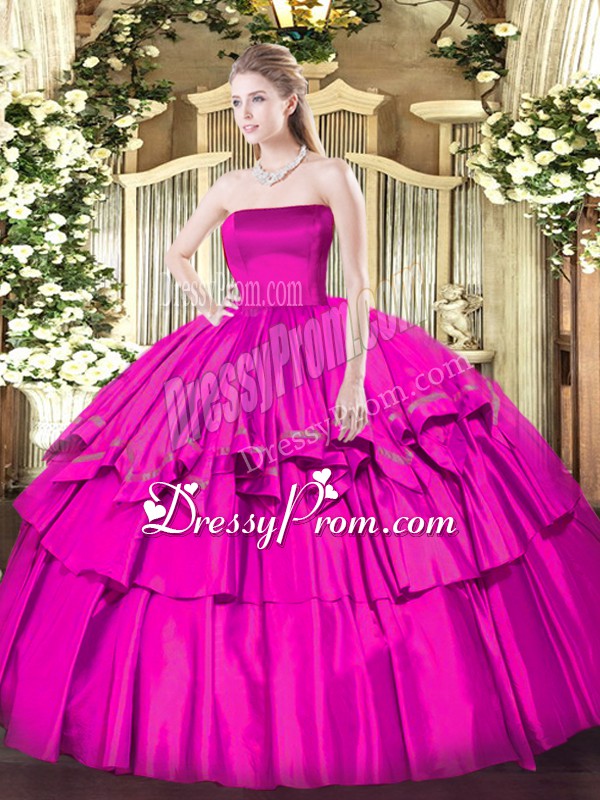 Neckline : StraplessShown Color : FuchsiaSilhouette : Ball GownsSleeve Length : sleevelessHemline : floor lengthBack Detail : ZipperFabric : Organza,TaffetaEmbellishment : Ruffled LayersOccasion : Military Ball,Sweet 16,QuinceaneraSeason : Spring,Summer,Fall,Winter