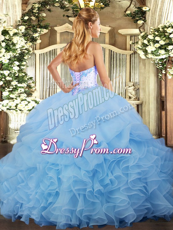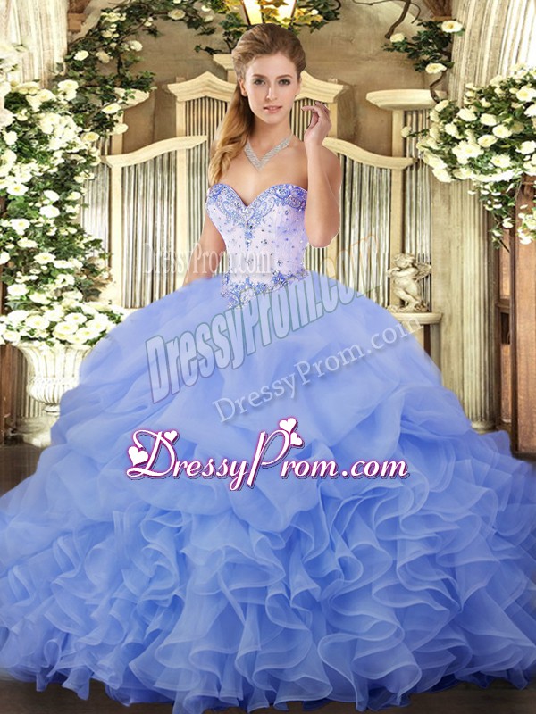 Neckline : SweetheartShown Color : LavenderSilhouette : Ball GownsSleeve Length : sleevelessHemline : floor lengthBack Detail : Lace upFabric : OrganzaEmbellishment : Beading,Ruffles,Pick UpsOccasion : Military Ball,Sweet 16,QuinceaneraSeason : Spring,Summer,Fall,Winter