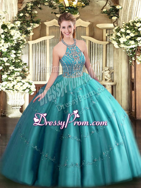 Neckline : Halter topShown Color : Teal Silhouette : Ball GownsSleeve Length : sleevelessHemline : floor lengthBack Detail : Lace upFabric : TulleEmbellishment : Beading,AppliquesOccasion : Military Ball,Sweet 16,QuinceaneraSeason : Spring,Summer,Fall,Winter
