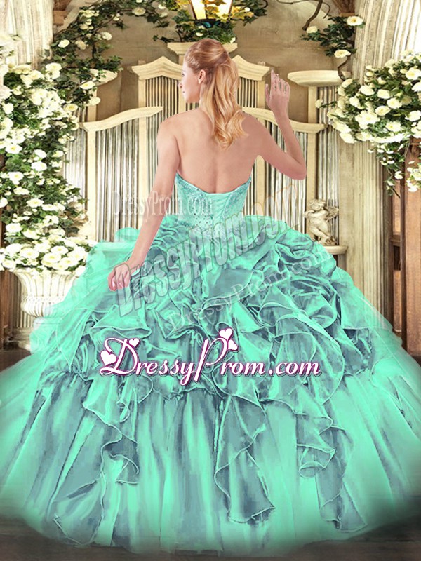Neckline : SweetheartShown Color : LilacSilhouette : Ball GownsSleeve Length : sleevelessHemline : floor lengthBack Detail : Lace upFabric : OrganzaEmbellishment : Beading,RufflesOccasion : Military Ball,Sweet 16,QuinceaneraSeason : Spring,Summer,Fall,Winter