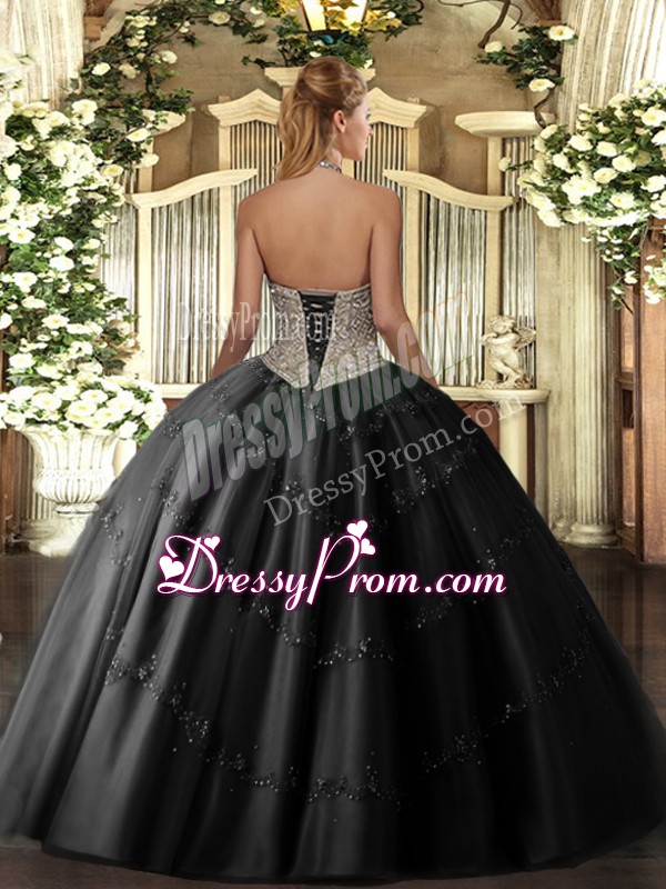 Fuchsia Vestidos de Quinceanera Military Ball and Sweet 16 and Quinceanera with Beading and Appliques Halter Top Sleeveless Lace Up