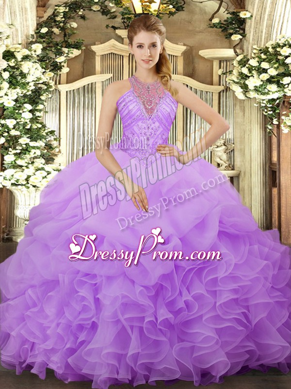Neckline : Halter topShown Color : LavenderSilhouette : Ball GownsSleeve Length : sleevelessHemline : floor lengthBack Detail : Lace upFabric : OrganzaEmbellishment : Beading,Ruffles,Pick UpsOccasion : Military Ball,Sweet 16,QuinceaneraSeason : Spring,Summer,Fall,Winter
