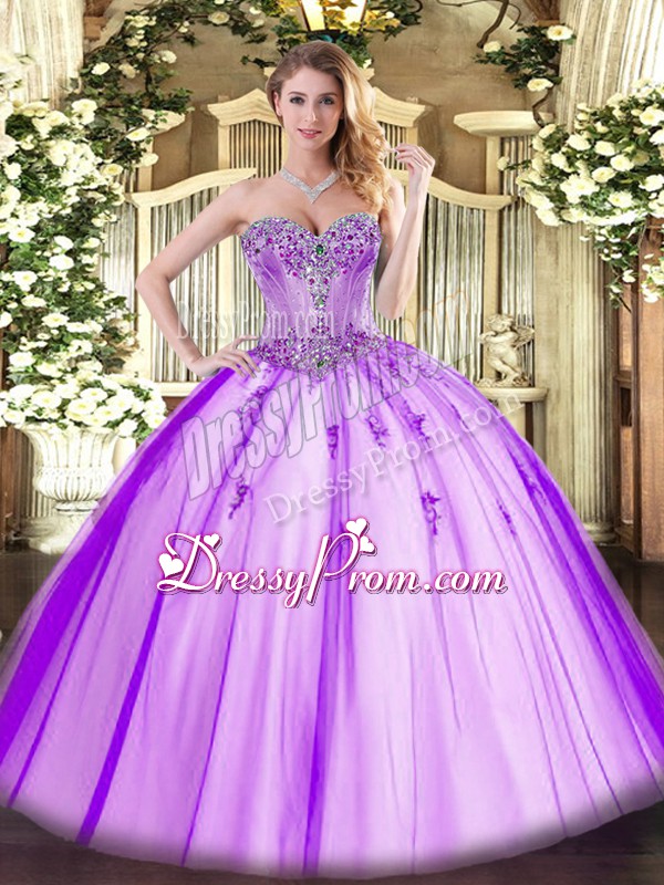 Neckline : SweetheartShown Color : LavenderSilhouette : Ball GownsSleeve Length : sleevelessHemline : floor lengthBack Detail : Lace upFabric : TulleEmbellishment : Beading,AppliquesOccasion : Sweet 16,QuinceaneraSeason : Spring,Summer,Fall,Winter