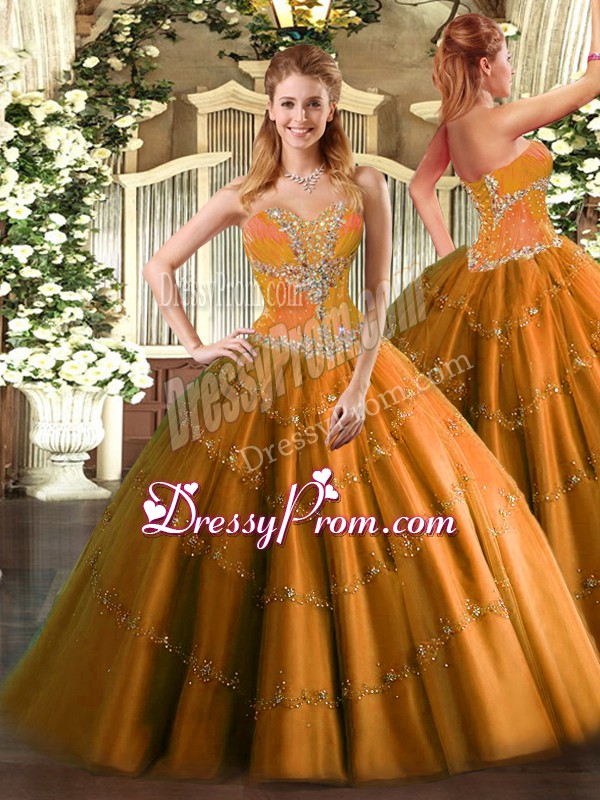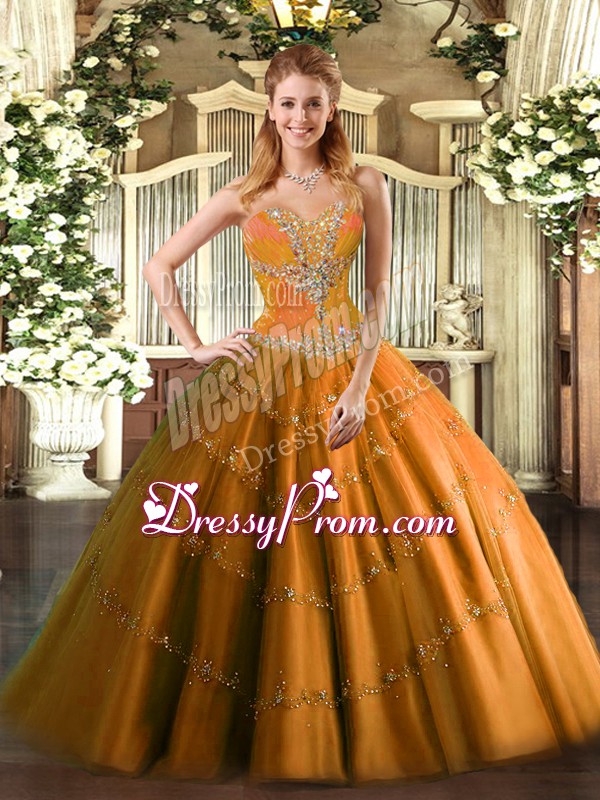 Neckline : SweetheartShown Color : OrangeSilhouette : Ball GownsSleeve Length : sleevelessHemline : floor lengthBack Detail : Lace upFabric : TulleEmbellishment : BeadingOccasion : Sweet 16,QuinceaneraSeason : Spring,Summer,Fall,Winter