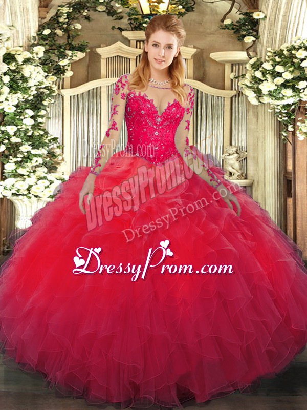 Neckline : ScoopShown Color : RedSilhouette : Ball GownsSleeve Length : long sleevesHemline : floor lengthBack Detail : Lace upFabric : OrganzaEmbellishment : Lace,RufflesOccasion : Military Ball,Sweet 16Season : Spring,Summer,Fall,Winter