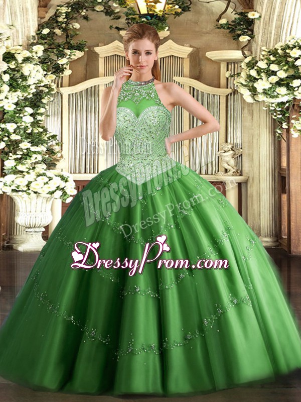 Neckline : Halter topShown Color : GreenSilhouette : Ball GownsSleeve Length : sleevelessHemline : floor lengthBack Detail : Lace upFabric : TulleEmbellishment : Beading,AppliquesOccasion : Military Ball,Sweet 16,QuinceaneraSeason : Spring,Summer,Fall,Winter