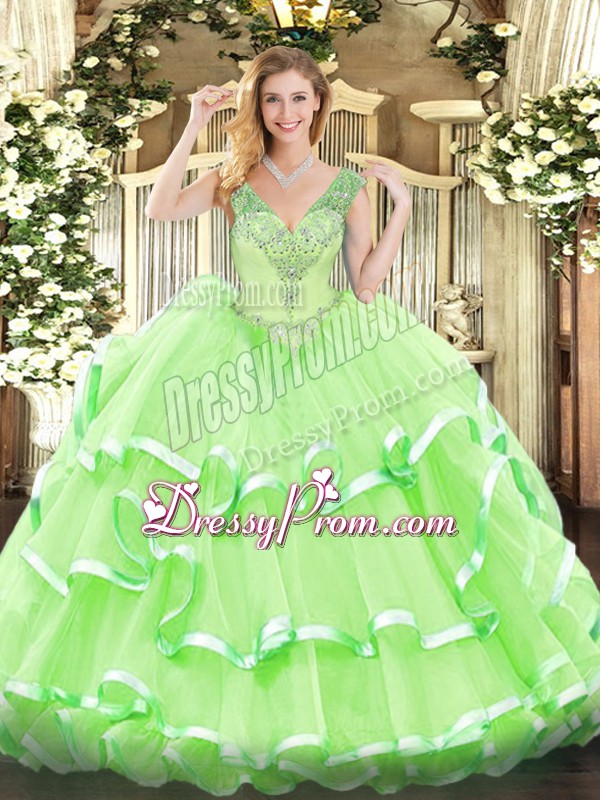 Neckline : V-neckShown Color : Spring GreenSilhouette : Ball GownsSleeve Length : sleevelessHemline : floor lengthBack Detail : Lace upFabric : OrganzaEmbellishment : Beading,Ruffled LayersOccasion : Military Ball,Sweet 16,QuinceaneraSeason : Spring,Summer,Fall,Winter