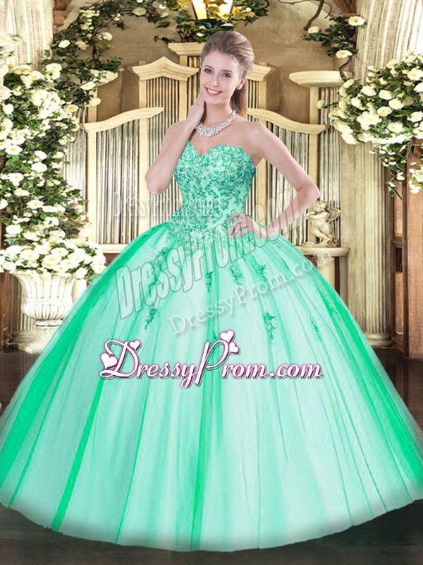 Neckline : SweetheartShown Color : TurquoiseSilhouette : Ball GownsSleeve Length : sleevelessHemline : floor lengthBack Detail : Lace upFabric : TulleEmbellishment : AppliquesOccasion : Military Ball,Sweet 16,QuinceaneraSeason : Spring,Summer,Fall,Winter