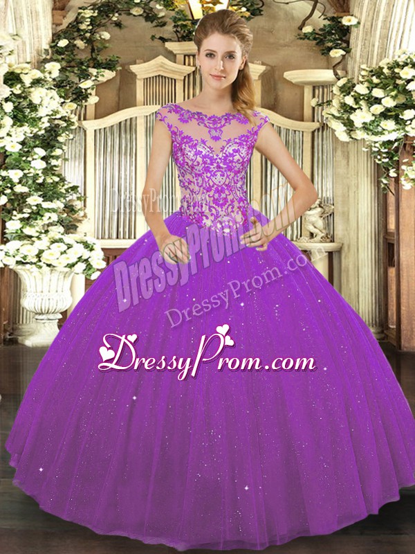 Neckline : ScoopShown Color : Eggplant PurpleSilhouette : Ball GownsSleeve Length : sleevelessHemline : floor lengthBack Detail : Lace upFabric : TulleEmbellishment : Beading,AppliquesOccasion : Sweet 16,QuinceaneraSeason : Spring,Summer,Fall,Winter