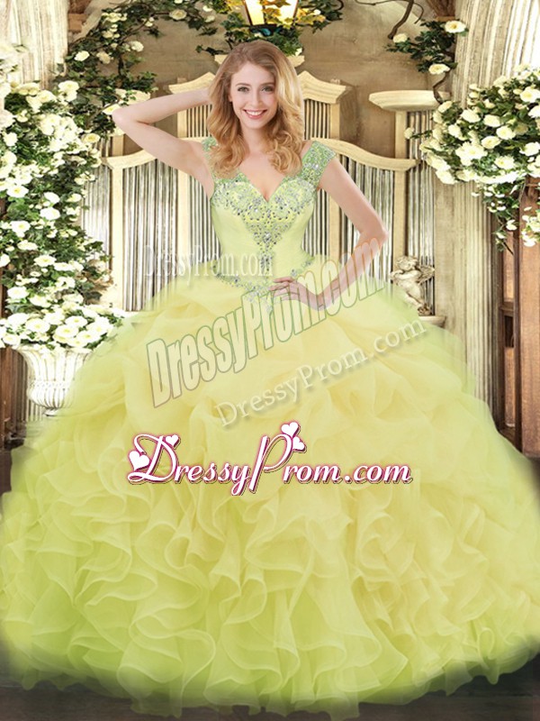 Neckline : V-neckShown Color : YellowSilhouette : Ball GownsSleeve Length : sleevelessHemline : floor lengthBack Detail : Lace upFabric : OrganzaEmbellishment : Beading,Ruffles,Pick UpsOccasion : Military Ball,Sweet 16,QuinceaneraSeason : Spring,Summer,Fall,Winter