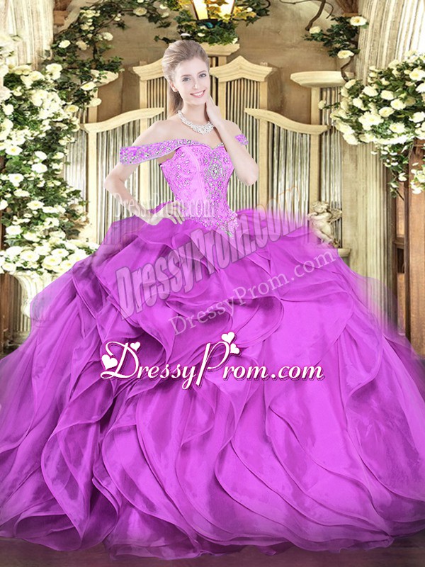Neckline : Off the shoulderShown Color : LilacSilhouette : Ball GownsSleeve Length : sleevelessHemline : floor lengthBack Detail : Lace upFabric : OrganzaEmbellishment : Beading,RufflesOccasion : Military Ball,Sweet 16,QuinceaneraSeason : Spring,Summer,Fall,Winter