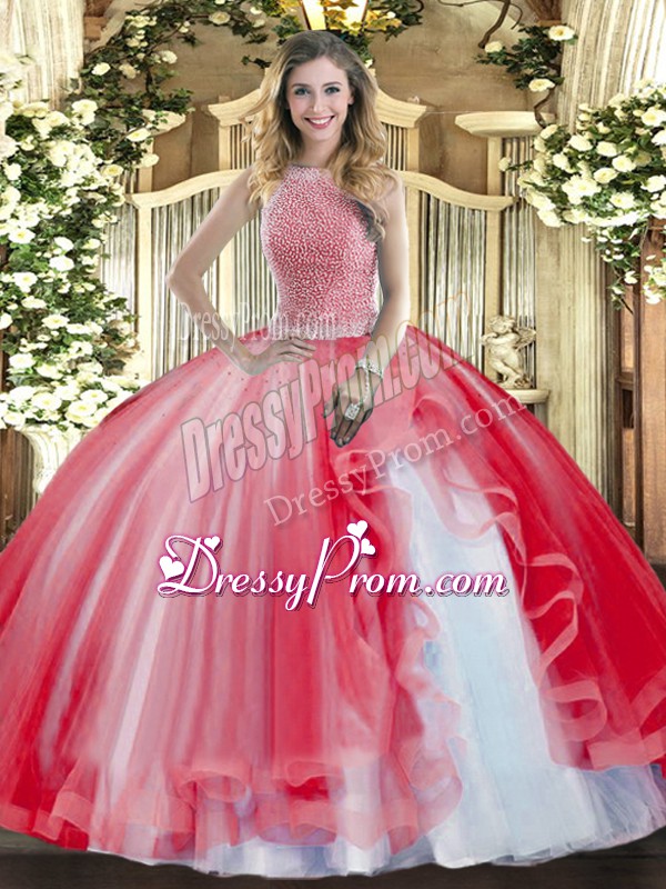 Neckline : High-neckShown Color : RedSilhouette : Ball GownsSleeve Length : sleevelessHemline : floor lengthBack Detail : Lace upFabric : TulleEmbellishment : Beading,RufflesOccasion : Military Ball,Sweet 16,QuinceaneraSeason : Spring,Summer,Fall,Winter