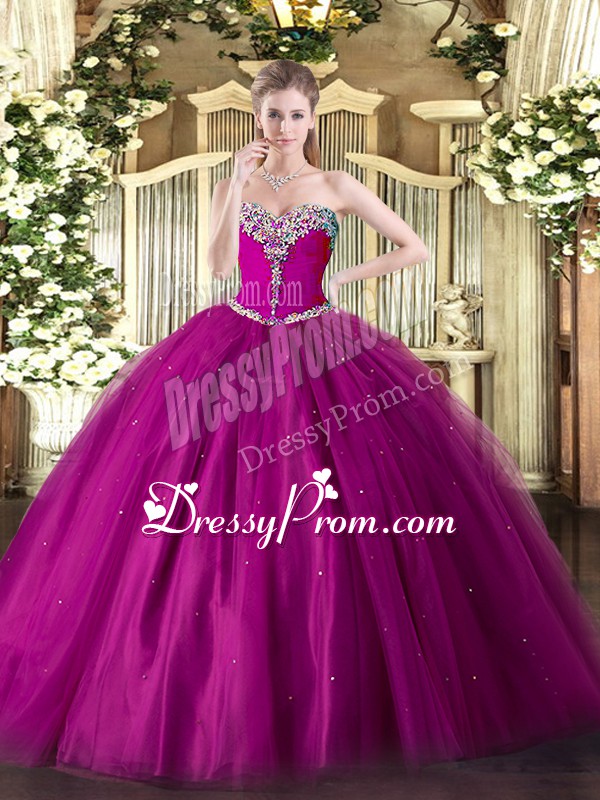 Fuchsia Lace Up Sweetheart Beading Vestidos de Quinceanera Tulle Sleeveless