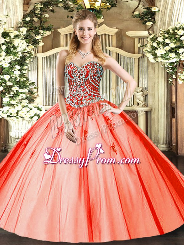 Neckline : SweetheartShown Color : Orange RedSilhouette : Ball GownsSleeve Length : sleevelessHemline : floor lengthBack Detail : Lace upFabric : TulleEmbellishment : Beading,AppliquesOccasion : Military Ball,Sweet 16,QuinceaneraSeason : Spring,Summer,Fall,Winter