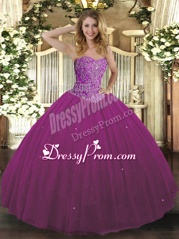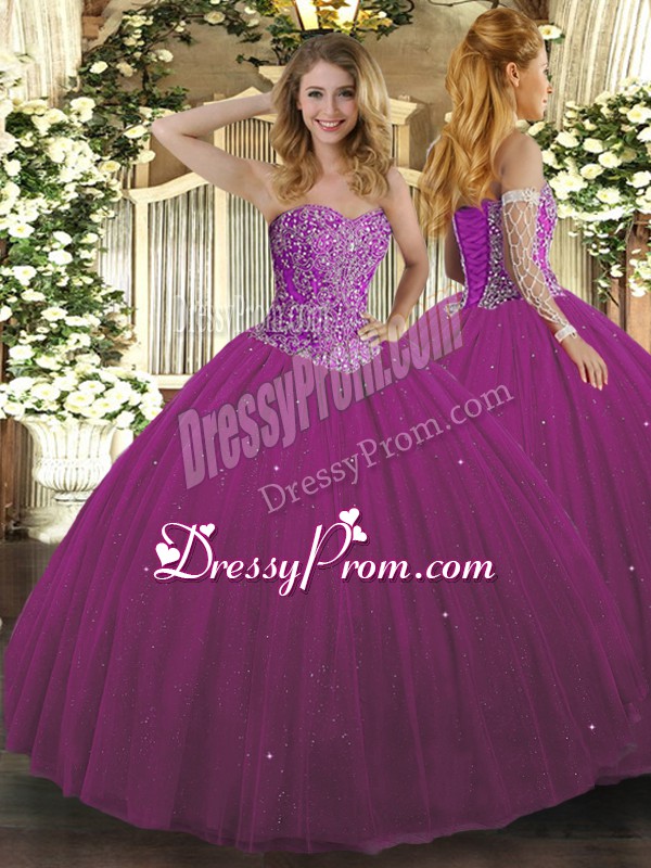 Neckline : SweetheartShown Color : FuchsiaSilhouette : Ball GownsSleeve Length : sleevelessHemline : floor lengthBack Detail : Lace upFabric : TulleEmbellishment : BeadingOccasion : Military Ball,Sweet 16,QuinceaneraSeason : Spring,Summer,Fall,Winter