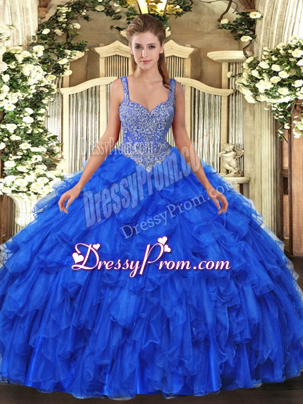Neckline : StrapsShown Color : Royal BlueSilhouette : Ball GownsSleeve Length : sleevelessHemline : floor lengthBack Detail : Lace upFabric : OrganzaEmbellishment : Beading,RufflesOccasion : Military Ball,Sweet 16,QuinceaneraSeason : Spring,Summer,Fall,Winter