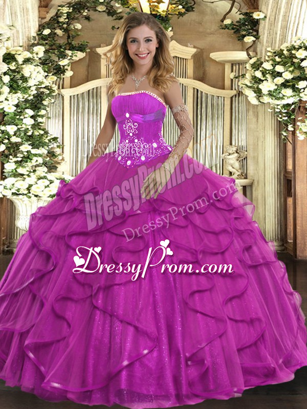 Neckline : StraplessShown Color : FuchsiaSilhouette : Ball GownsSleeve Length : sleevelessHemline : floor lengthBack Detail : Lace upFabric : TulleEmbellishment : Beading,RufflesOccasion : Military Ball,Sweet 16,QuinceaneraSeason : Spring,Summer,Fall,Winter
