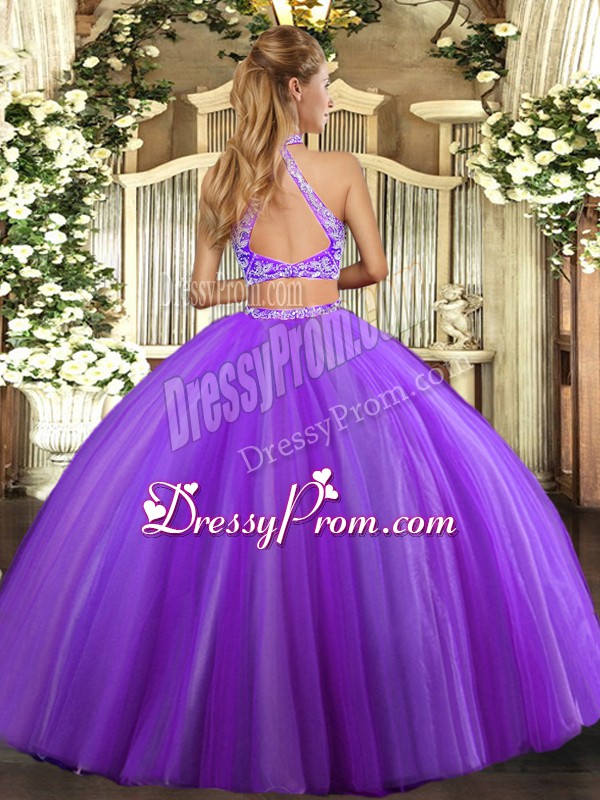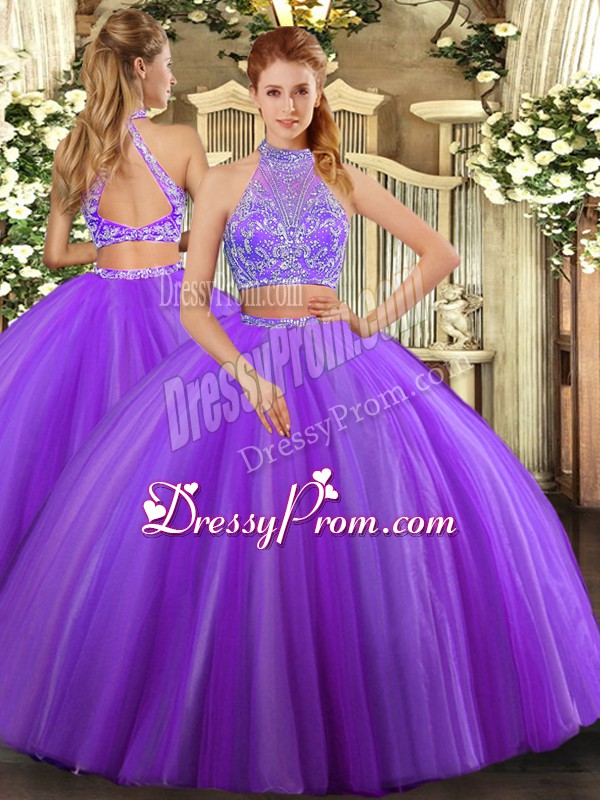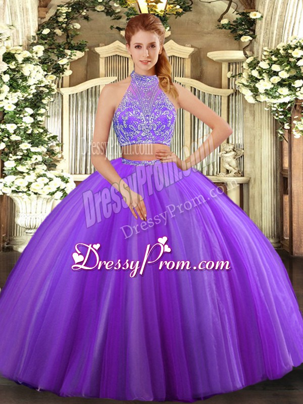 Neckline : Halter topShown Color : LavenderSilhouette : Two PiecesSleeve Length : sleevelessHemline : floor lengthBack Detail : Criss crossFabric : TulleEmbellishment : BeadingOccasion : Military Ball,Sweet 16,QuinceaneraSeason : Spring,Summer,Fall,Winter