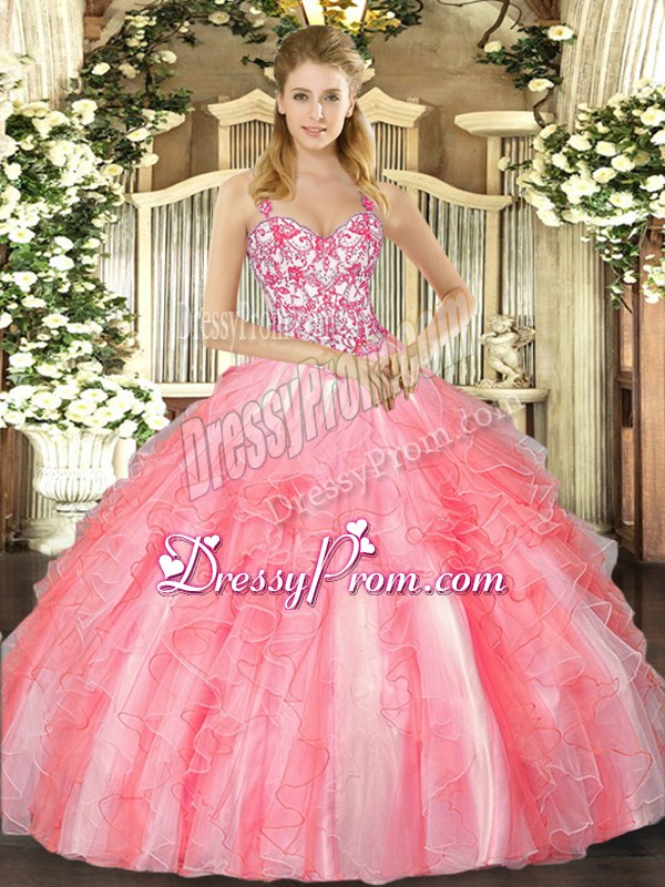 Neckline : StrapsShown Color : Coral RedSilhouette : Ball GownsSleeve Length : sleevelessHemline : floor lengthBack Detail : Lace upFabric : TulleEmbellishment : Beading,RufflesOccasion : Sweet 16,QuinceaneraSeason : Spring,Summer,Fall,Winter