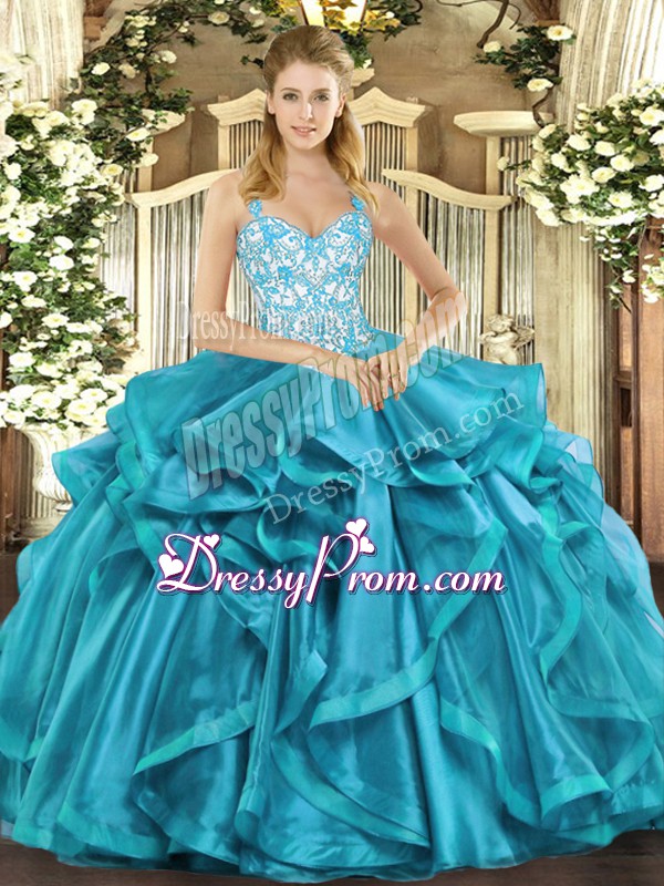 Neckline : StrapsShown Color : Teal Silhouette : Ball GownsSleeve Length : sleevelessHemline : floor lengthBack Detail : Lace upFabric : OrganzaEmbellishment : Beading,Appliques,RufflesOccasion : Sweet 16,QuinceaneraSeason : Spring,Summer,Fall,Winter