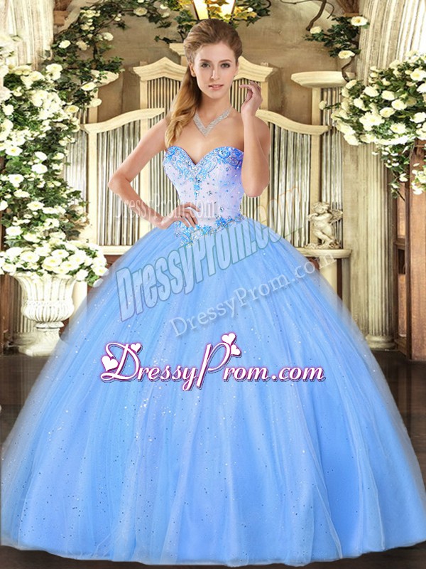 Graceful Baby Blue Ball Gowns Sweetheart Sleeveless Tulle Floor Length Lace Up Beading Vestidos de Quinceanera